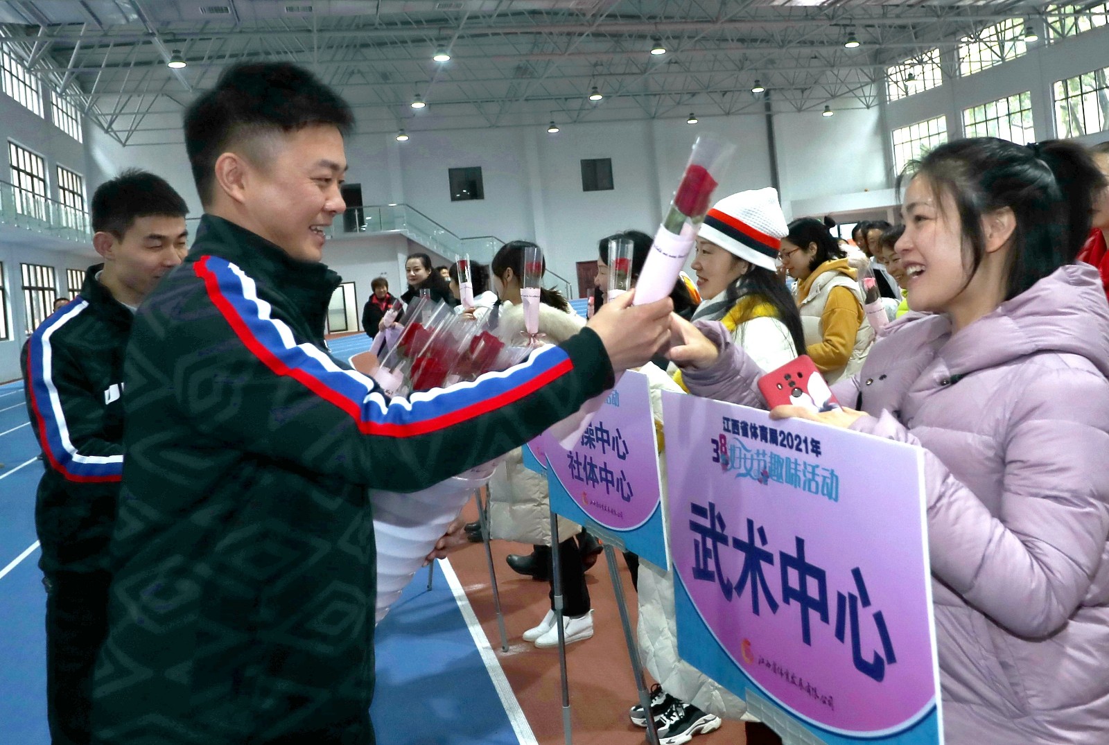 趣味賽特設(shè)暖男獻(xiàn)花環(huán)節(jié),為每一位參賽者送上鮮花,感謝她們一年來(lái)辛勤付出,為江西體育事業(yè)發(fā)展做出了積極貢獻(xiàn)。本次三八節(jié)趣味賽拓寬了省體育系統(tǒng)女干部職工的業(yè)余文化生活,團(tuán)結(jié)引領(lǐng)廣大女干部職工立足崗位、爭(zhēng)創(chuàng)一流,以更加飽滿(mǎn)的熱情參與江西體育事業(yè)大發(fā)展。